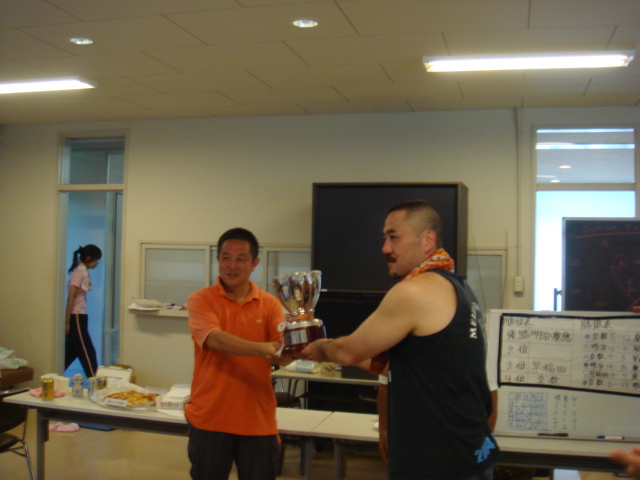 優勝カップを受け取る土井主将と慶応浅田主将